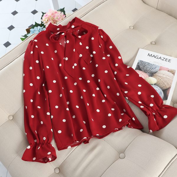 Blue/Red/Beige Polka Dot Chiffon Blouse Women Autumn Vintage Bow Collar Flare Long Sleeve Loose Shirt Female Elegant Blusas