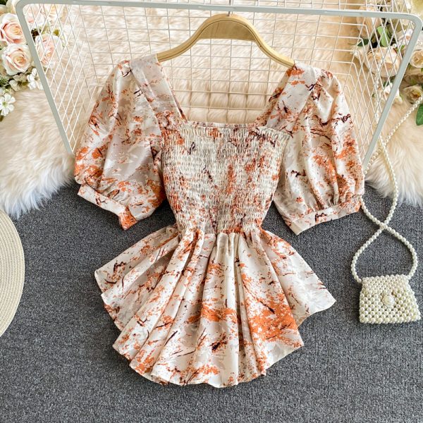 Summer Bohemian Printed Irregular Short Blouse Women Elegant Square Collar Short Puff Sleeve Sexy Ruffle Tops Female Blusas