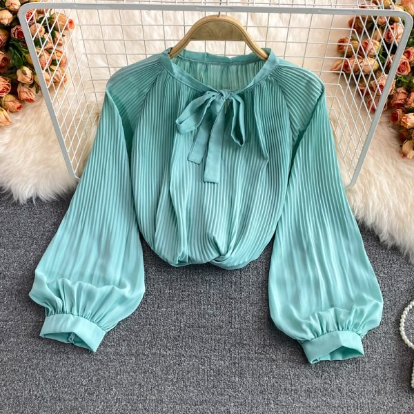 Yellow/Pink/Beige Dye Tie Pleated Chiffon Blouse Women Autumn Casual Draped Shirt Female Puff Long Sleeve Tops New Fashion