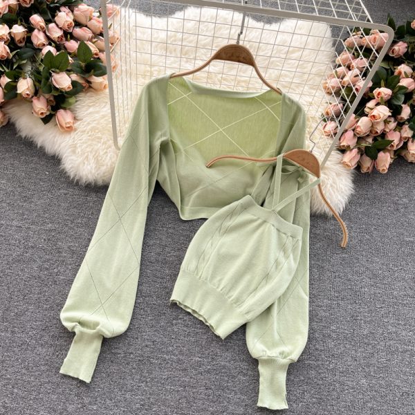 Autumn Black/White O-Neck Single Breasted Long Sleeve Cardigans + Short Camis Two Pieces Suit Women Casual 2pcs Set New