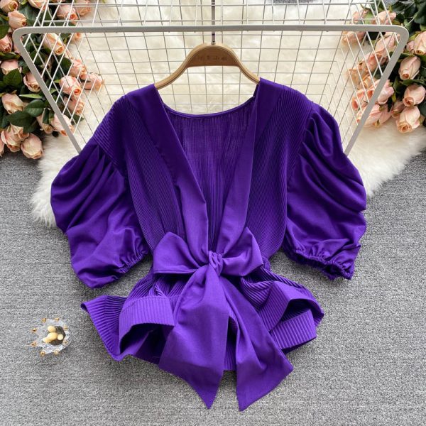 Sexy Deep V-Neck Pleated Blouse Women Purple/Black/White Draped Tops Female Casual Bandage Short Shirt Female Summer New
