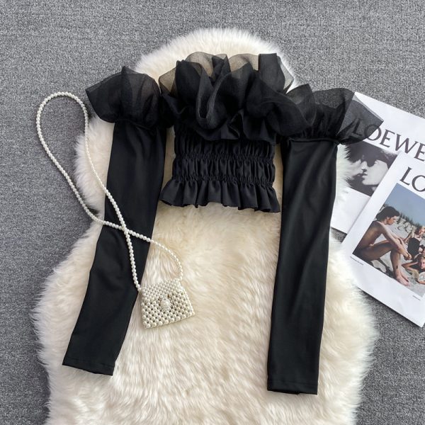 Summer Sexy Black Mesh Party Blouse Women Black Slash Neck Ruffle Long Sleeve Short Shirt Female Club Strapless Tops New