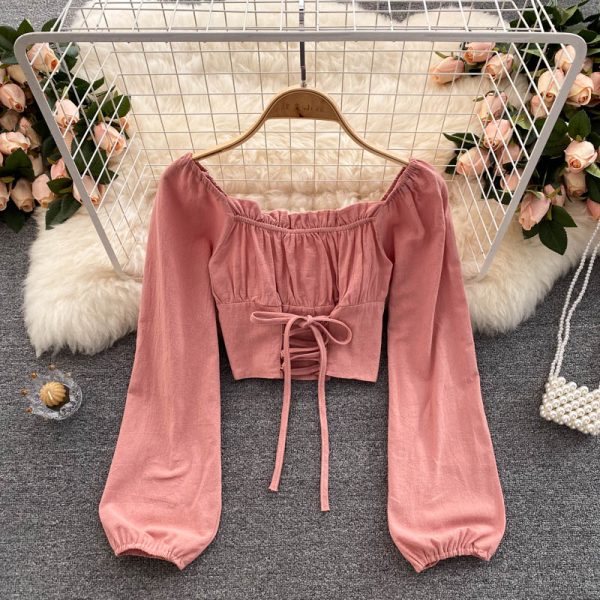 Autumn Women Vintage Slash Neck Bandage Blouse Sexy Puff Long Sleeve Short Shirts Female Black/White/Pink Tops New Fashion