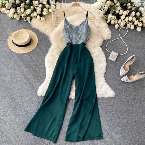 Vintage Women Lace Patchwork Rompers Female Summer Sexy V-Neck Sleeveless Wide Leg Spaghetti Strap Jumpsuit Green/Red Playsuits