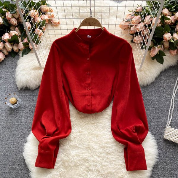 Autumn Women Red Single Breasted Blouse Vintage O-Neck Long Sleeve Casual Shirt Female Elegant Party Tops New Fashion Blusas