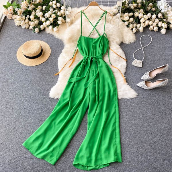 Summer Green Spaghetti Strap Jumpsuits For Women Sexy Slash Neck Open Back Slim High Waist Romper With Sashes Female New