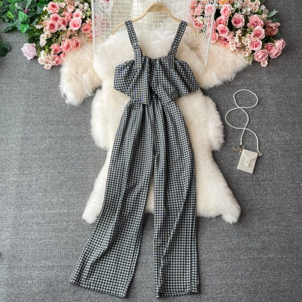 Summer Khaki/Blue/Black Plaid Romper Women Sexy Off Shoulder Ruffle Loose Jumpsuits Female High Waist Wide Leg Playsuit New