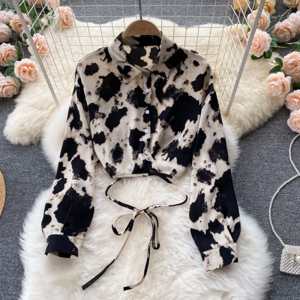 Autumn Women Ink Printed Drawstring Blouse Female Vintage Turn-Down Collar Single Breasted Short Tops Female Elegant Blusas