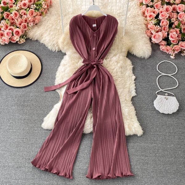 Casual Single Breasted Pleated Romper Women Vintage V-Neck Sleeveless High Waist Wide Leg Jumpsuits Female With Sashes Summer