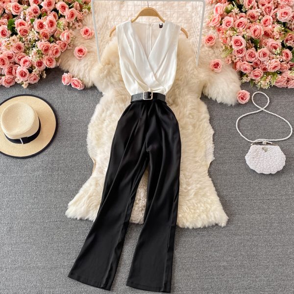 Women Black/White Patchwork Romper Office Ladies Sleeveless High Waist Wide Leg Jumpsuits Casual Female Playsuits OL New