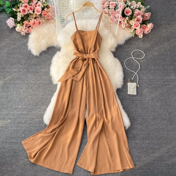 Summer Sexy Spaghetti Strap Romper Female Casual Khaki/Beige/Black Wide Leg Split Jumpsuit Women Beach Playsuits With Sashes New