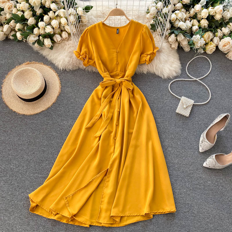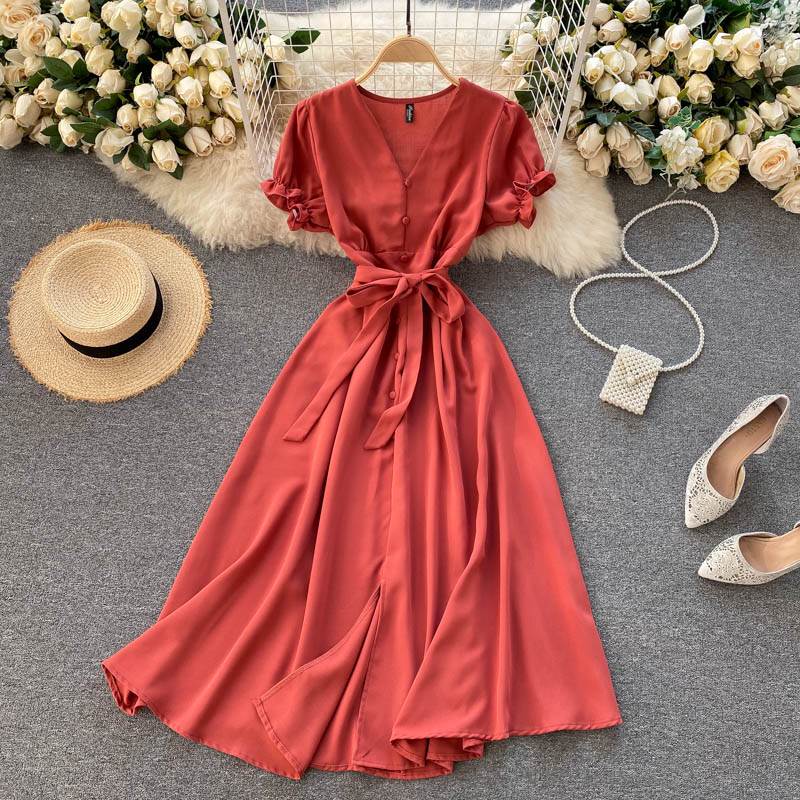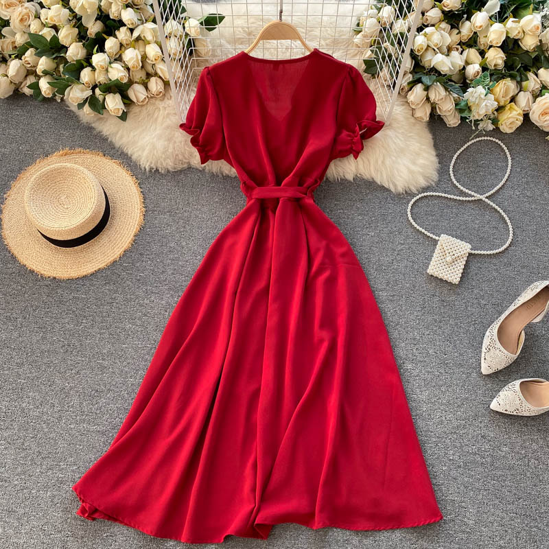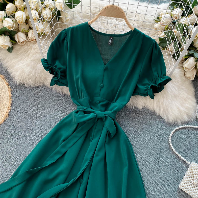 Cheap Dresses, Buy Quality Women’s Clothing Directly from China Suppliers:Vintage V Neck Short Puff Sleeve Green/Blue/Red Midi Dress Women Elegant High Waist A Line Vestidos With Sashes Summer New