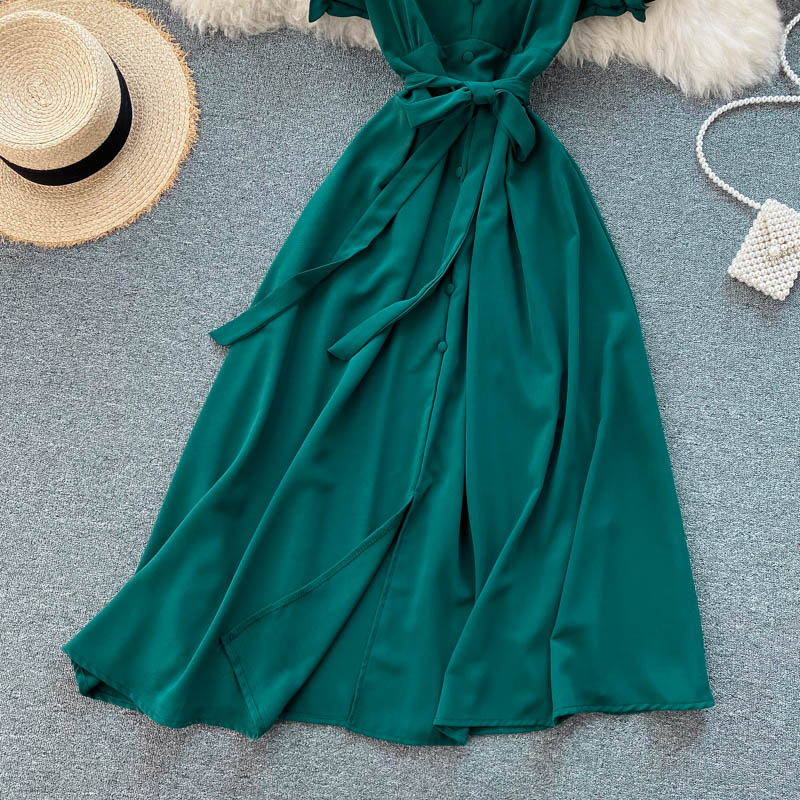 Vintage V-Neck Short Puff Sleeve Green/Blue/Red Midi Dress Women Elegant High Waist A-Line Vestidos With Sashes Summer New