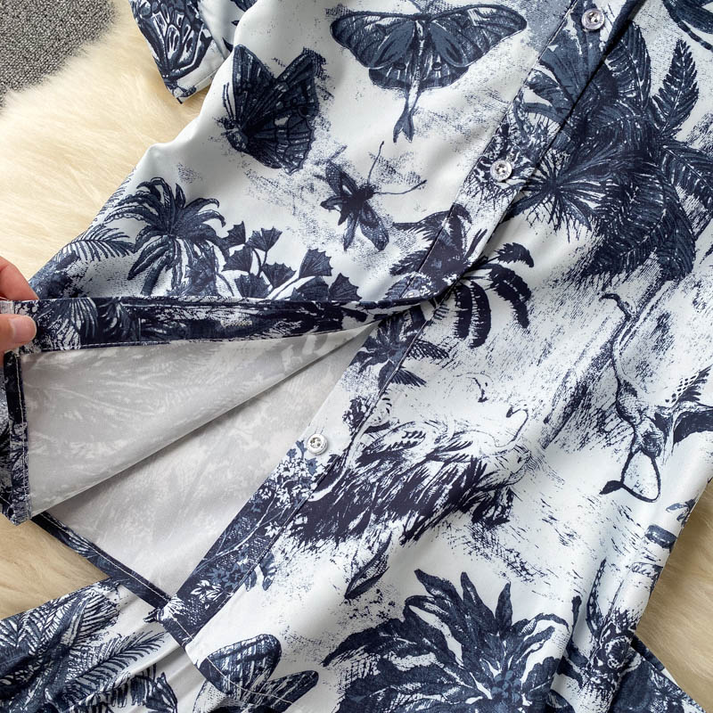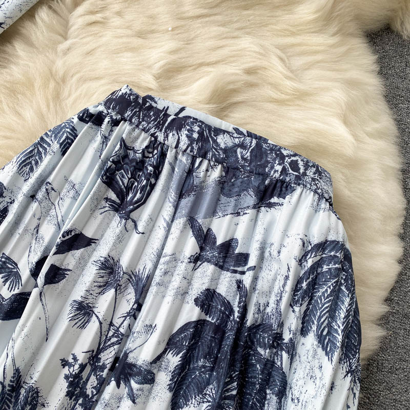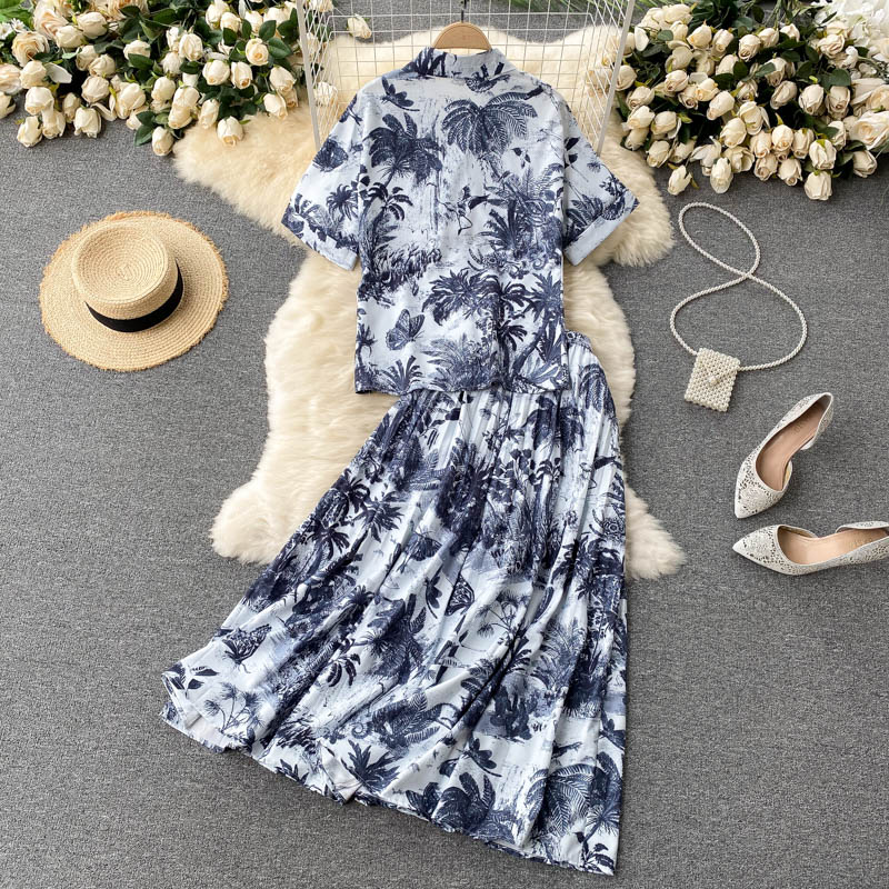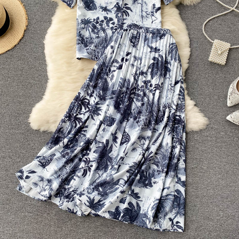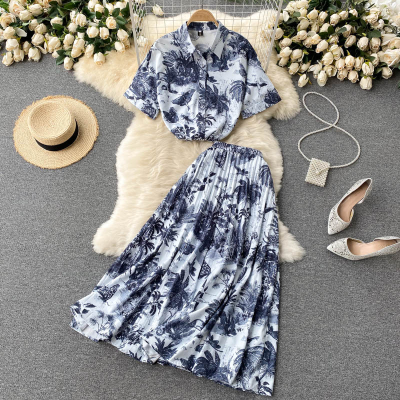 Summer Blue Print 2Pcs Set Women Casual Turn-Down Collar Single Breasted Short Tops + High Waist Draped Skirt Suit Female