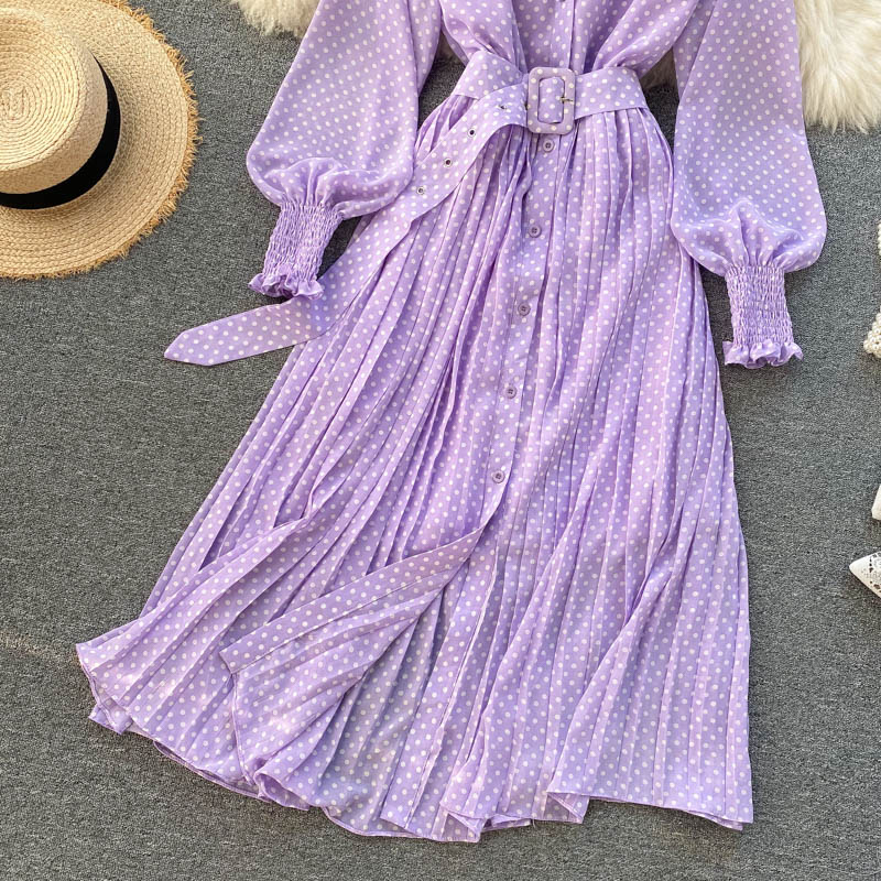 Vintage Purple/White Polka Dot Chiffon Long Dress Spring Autumn Casual Lantern Sleeve High Waist Pleated Maxi Robe Female
