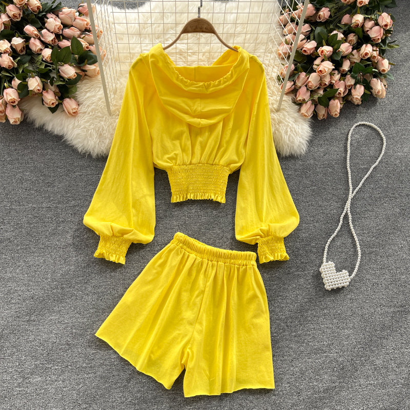 Women Yellow/White/Gray Sport 2Pcs Set Autumn Casual Hooded Cardigans Hoodies + High Waist Shorts Female Fashion Suits New