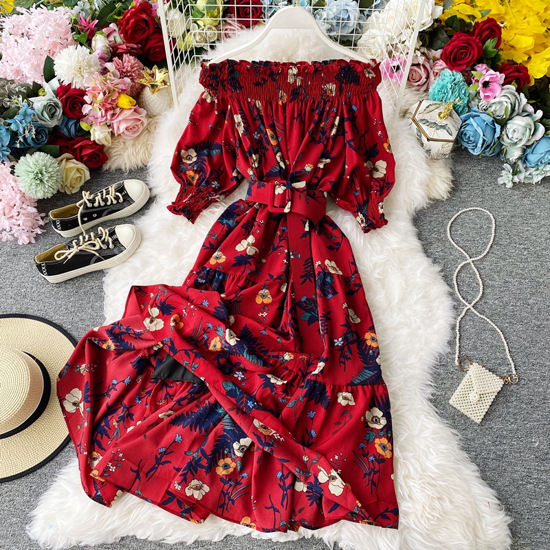 Cheap Dresses, Buy Quality Women’s Clothing Directly from China Suppliers:Bohemian Summer Vacation Beach Women Floral Print Chiffon Dress Sexy Slash Neck Off Shoulder Blue/Red Dresse Female New