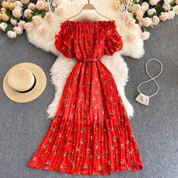 Summer Sexy Slash Neck Chiffon Pleated Dress Women Vacation Beach Floral Printed Draped Vestidos Yellow/Red/White Robe New