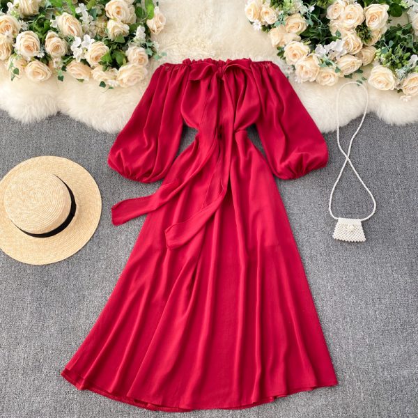 Sexy Slash Neck Puff Sleeve Yellow/Red/White Party Beach Dress Women Elegant High Waist Big Swing Vestidos Spring Autumn Fashion