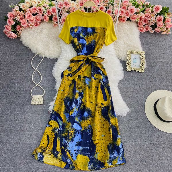 Vintage Printed Patchwork Long Dress Women Elegant Round Neck Short Sleeve High Waist Vestidos With Sashes Female Summer
