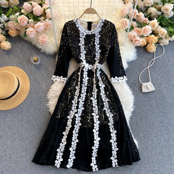 Spring Autumn Black Embroidered Party Dress Women Elegant O-Neck Big Swing Lace Vestidos Female Fashion New