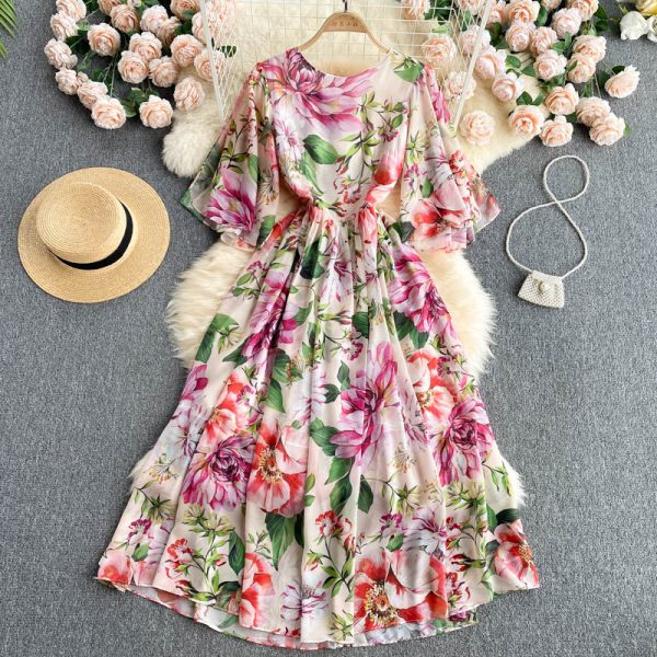 Bohemian Floral Chiffon Long Dress Summer Women Elegant O-Neck Flare Sleeve High Waist A-Line Vestidos Vacation Beach Maxi Robe