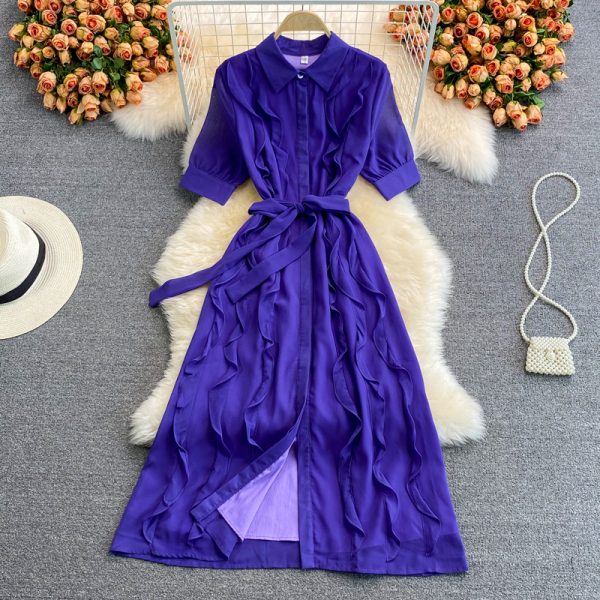 Vintage Blue Chiffon Party Dress Women Elegant Turn-Down Collar Short Sleeve Turn-Down Collar A-Line Vestidos Summer New