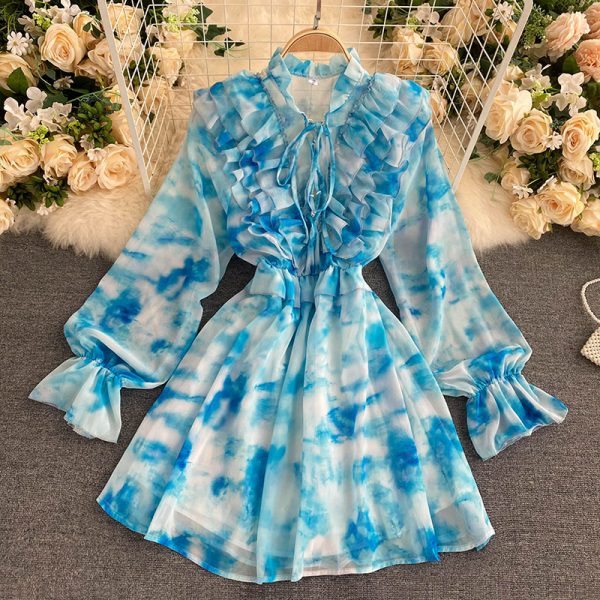 Autumn Blue Tie-Dye Mini Dress Women Sweet Ruffle Chiffon Vestidos Female Elegant Flare Long Sleeve Irregular Robe Fashion