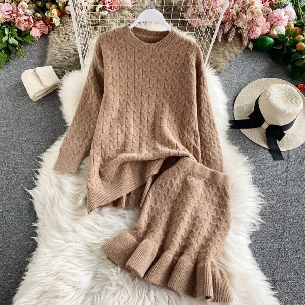 Women’s Loose Two Piece Set Casual O-Neck Long Sleeve Pullovers Jumper And High Waist Mermaid Mini Skirt Female Knit Suit Winter
