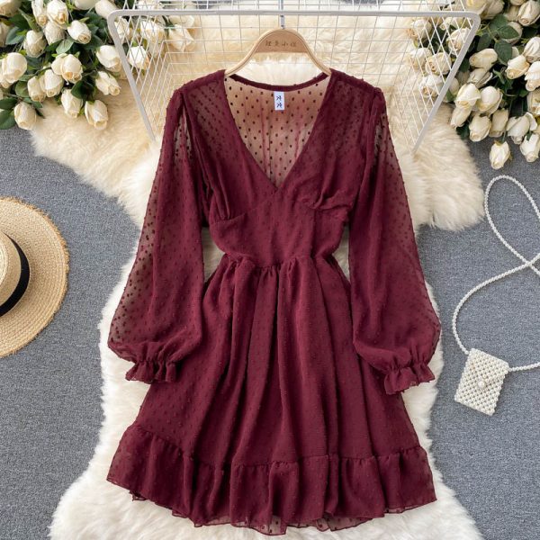 Sexy Polka Dot Chiffon Dress For Women V-Neck Puff Long Sleeve High Waist Ruffle Vestidos Casual Female Party Robe New
