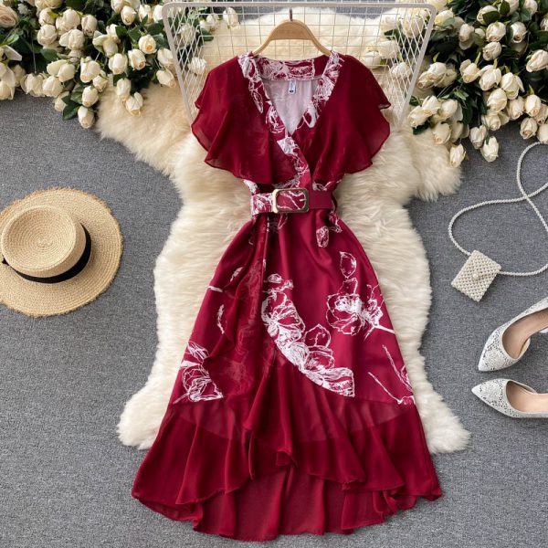 Summer Women Red/Green/White Irregular Ruffle Printed Patchwork Dress Office Ladies Casual Chiffon Ruffle Vestidos With Sashes