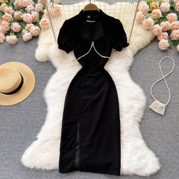 Vintage Black Hollow Out Beading Bodycon Mini Dress Sexy Stand Collar Short Sleeve High Waist Slim Vestidos Female Party Robe