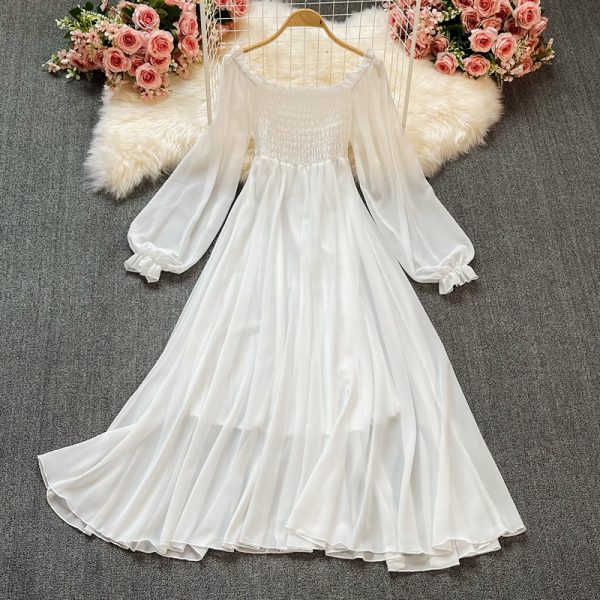 Vintage White Chiffon Party Dress Women Elegant Lantern Long Sleeve A-Line Casual High Waist Vestidos Female Spring Autumn