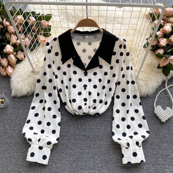 Autumn Office Lady White Polka Dot Blouse Women Elegant Turn-Down Collar Long Sleeve Single Breasted Loose Casual Shirts