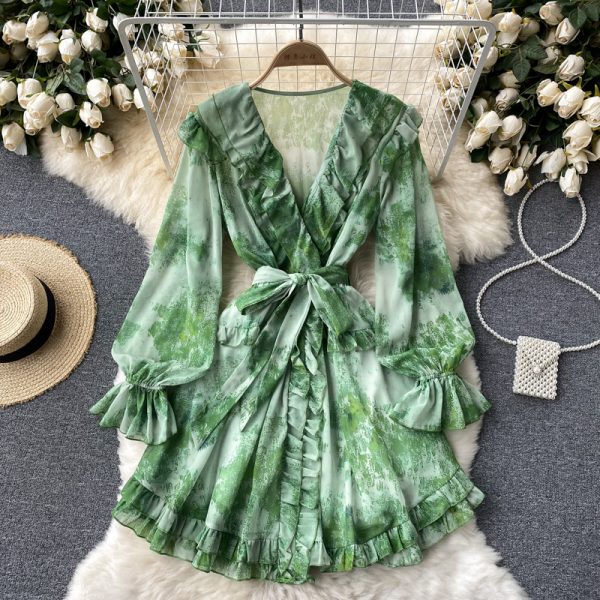 Autumn Bohemian Printed Mini Dress Women Sexy V-Neck Flare Long Sleeve High Waist Ruffle Vacation Party Beach Vestidos New