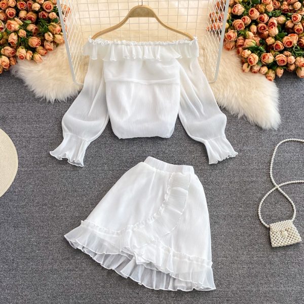 Sexy Slash Neck Chiffon 2Pcs Set Women Black/White Ruffle Long Sleeve Short Blouse High Waist Irregular Skirt Female Summer Suit