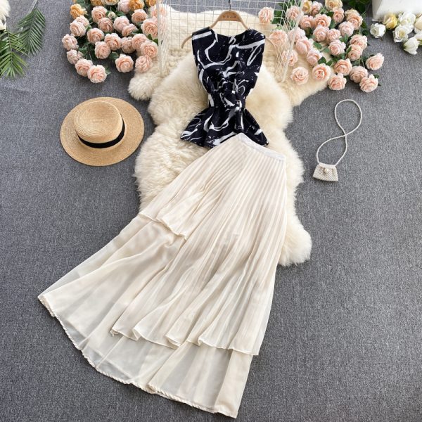 Summer Vintage Women Two Piece Set Casual O-Neck Sleeveless Slim Short Tops + Ruffle Irregular Pleated Skirt Suit Female