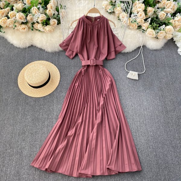 Red/Green/Khaki Pleated Long Dress Women Elegant O-Neck Short Sleeve High Waist Draped Vestidos With Sashes Female Spring Autumn