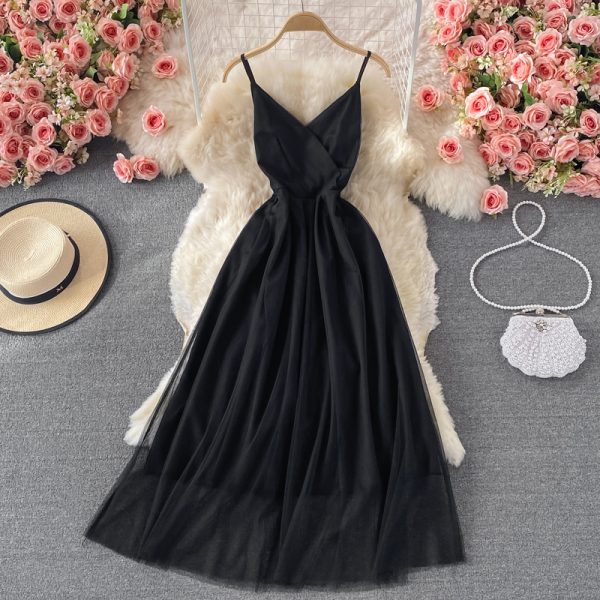 Black Sexy Mesh Long Dress Women Summer Elegant V-Neck Sleeveless Spaghetti Strap Vestidos Beach Vacation Party Robe New