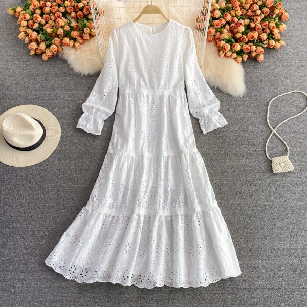 Vintage White Hollow Out Embroidered Midi Dress For Women Casual O-Neck Flare Long Sleeve Loose Vestidos Elegant Robe New