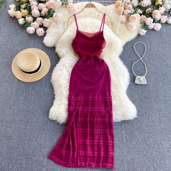 Summer Sexy Mesh Hollow Out Midi Dress Women Rose Red High Waist Spaghetti Strap Club Party Split Vestidos Female Fashion