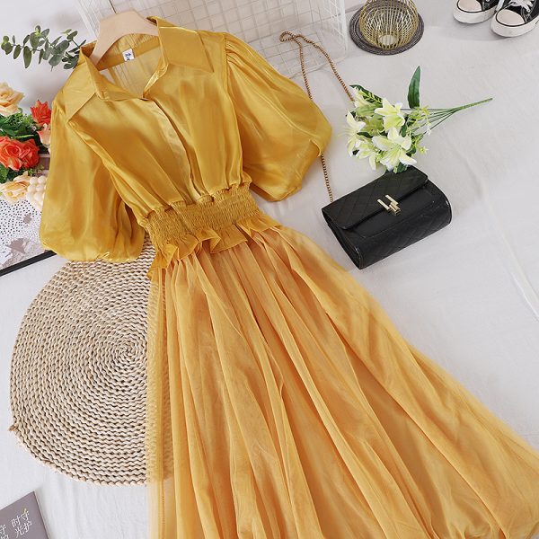 Summer Casual Yellow/Black/White Mesh Patchwork Long Dress Women Elegant Turn-Down Collar A-Line Ruffle Maxi Vestidos New
