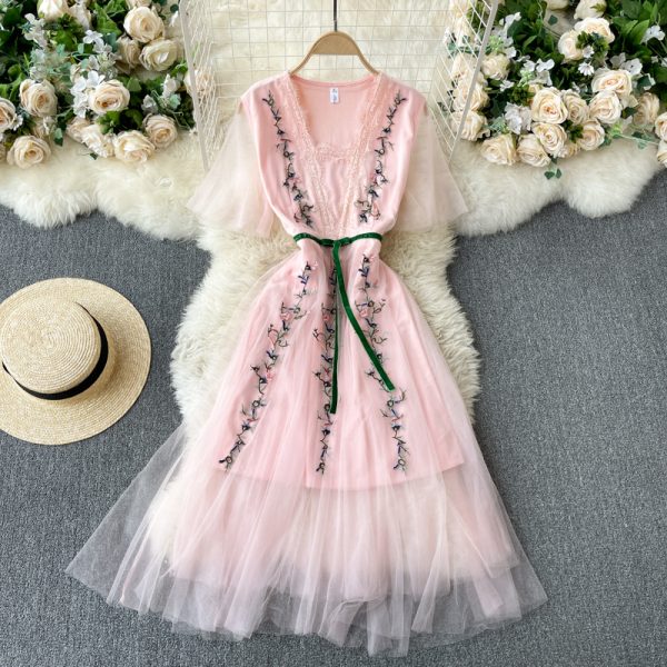 Black/Pink Mesh Embroidered Midi Dress Women Sweet Square Collar Short Sleeve High Waist Vestidos Female Summer New Fashion
