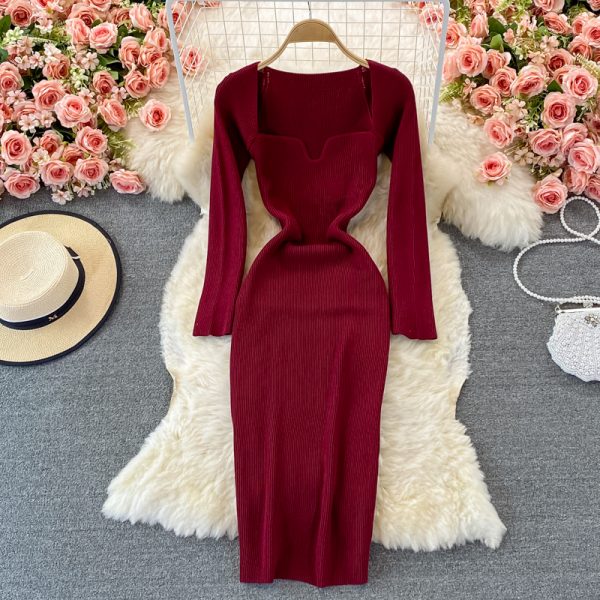 Women Square Collar Knitting Bodycon Dress Autumn Winter Elegant Long Sleeve High Waist Female Vestidos Casual Robe New
