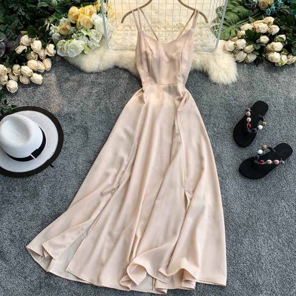 Summer Vacation Beach V-neck Backless Women Midi Dress Sexy Sleeveless Beige/Purple/Red/Yellow Strap Dress High Quality New