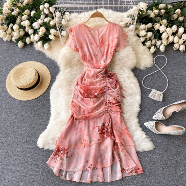 Women Sexy Party Midi Dress Summer Casual Pink Drawstring V-Neck Short Sleeve High Waist Ruffle Vestidos Female Beach Robe
