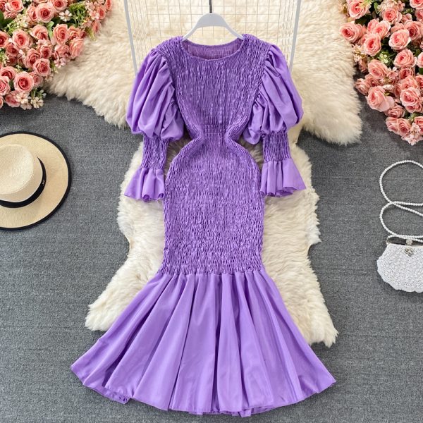 Purple/Red/White Mermaid Dress Women Spring Summer Round Neck Puff Sleeve High Waist Bodycon Vestidos Female Elegant Robe