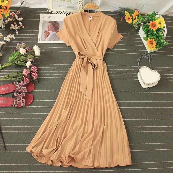 Summer Solid Green/Khaki Pleated Dress Women High Waist Short Sleeve Sashes Dresses Elegant Short Sleeve Vestidos New