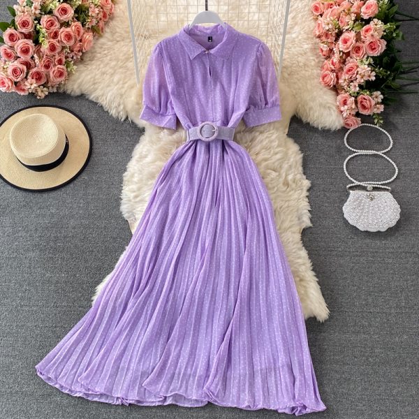 Summer Vintage Polka Dot Pleated Long Dress Women Blue/Red/Purple Draped Vestidos Casual Female High Waist Big Swing Robe