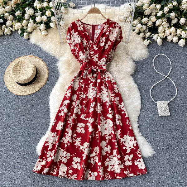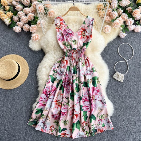 Women Flower Printed Midi Dress Summer Red/Pink/Blue Vestidos Female V-Neck Sleeveless High Waist A-Line Beach Party Robe